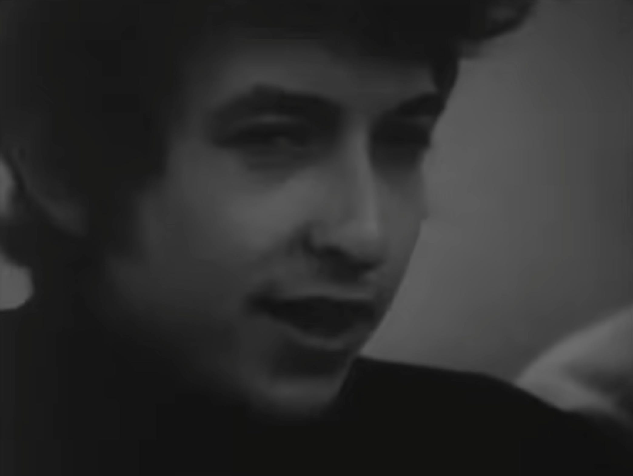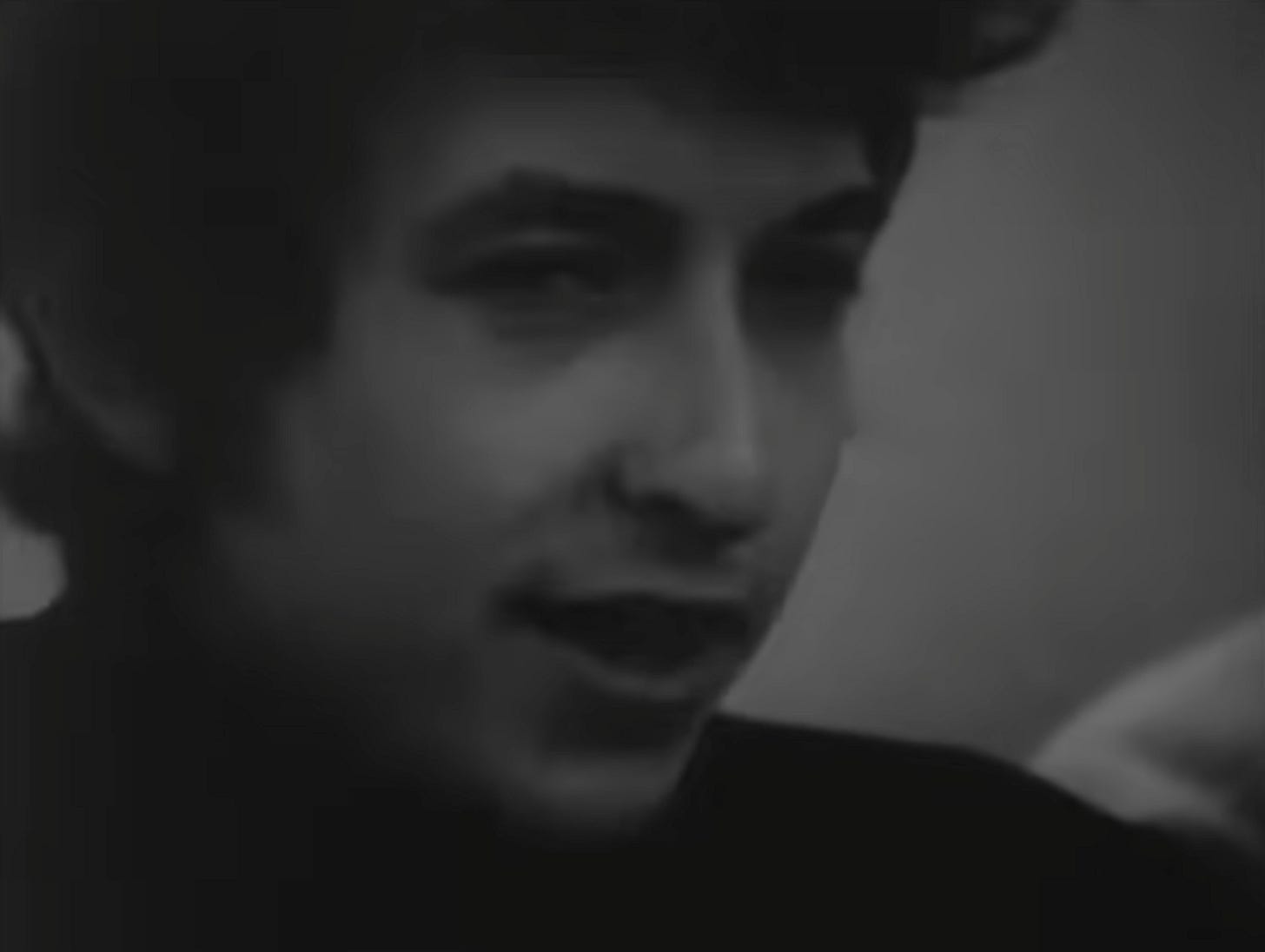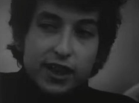Years later I saw the full video clip in Don’t Look Back. Dylan and Donovan are in a hotel room. Donovan plays a pretty lame song. His chorus, “I’ll sing a song for you, that’s what I’m here to do, to sing for you,” is mostly embarrassing in anticipation of whatever Bob has up his sleeve. Dylan is jittering in his chair waiting for Donovan to hand over the guitar. He’s like a racehorse behind the gate. In his mind he’s already left everyone else behind in the dust.